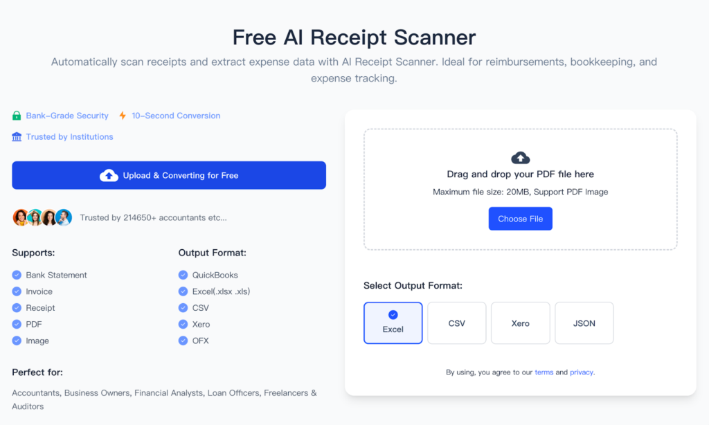 When you visit the BankGPT AI Receipt Scanner page, the first thing you notice is the lack of clutter. BankGPT has designed a “no-nonsense” interface. There are no intrusive ads or complicated menus. You upload your file, the AI processes it in seconds, and you download your formatted data.